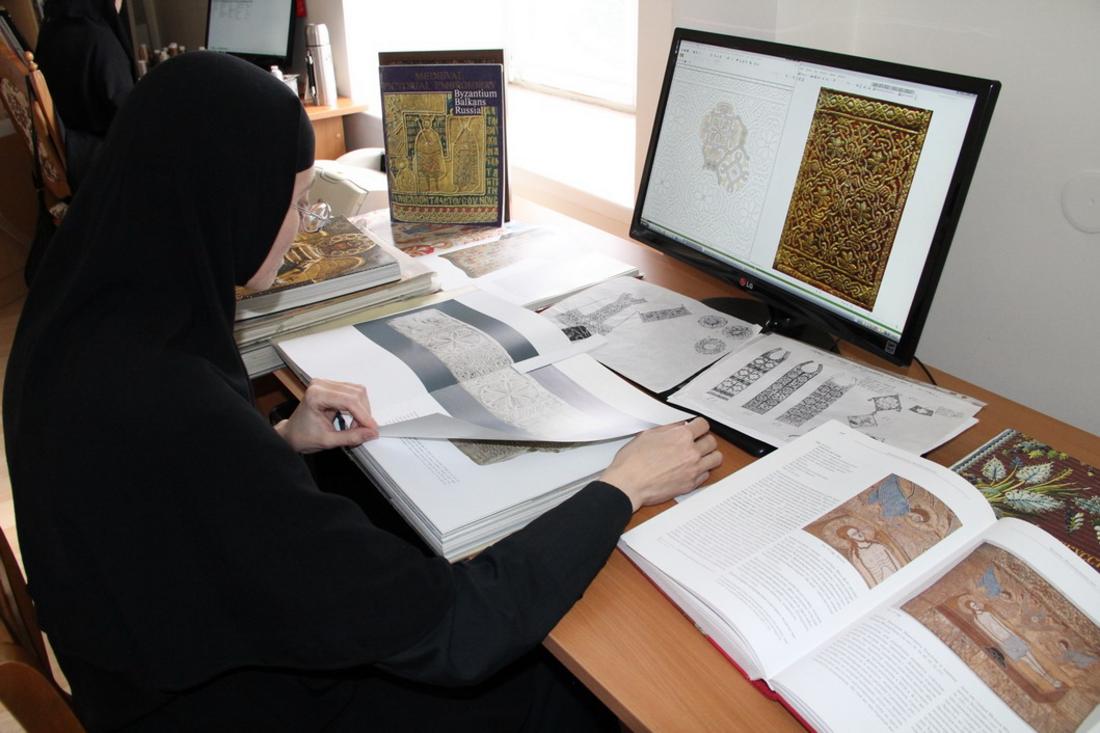 Всё начинается, конечно же, с поиска идеи. Каждое облачение, плащаница или любое другое изделие – это миниатюрное изображение духовного мира. И все его детали должны быть подобраны очень тщательно. Сестры просматривают множество узоров, орнаментов, икон, которые можно использовать в создании композиции.