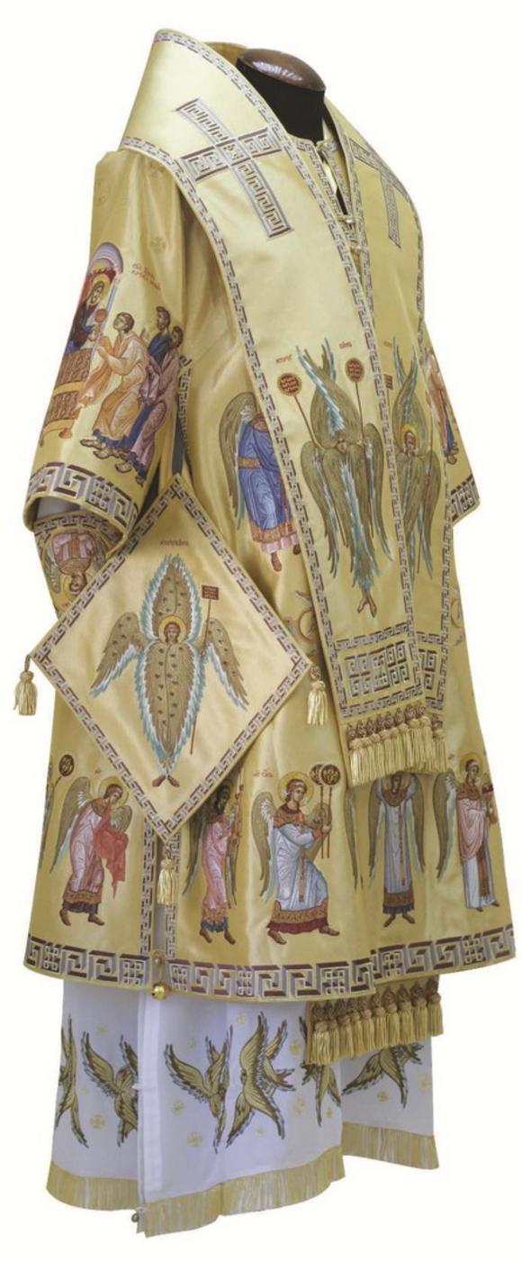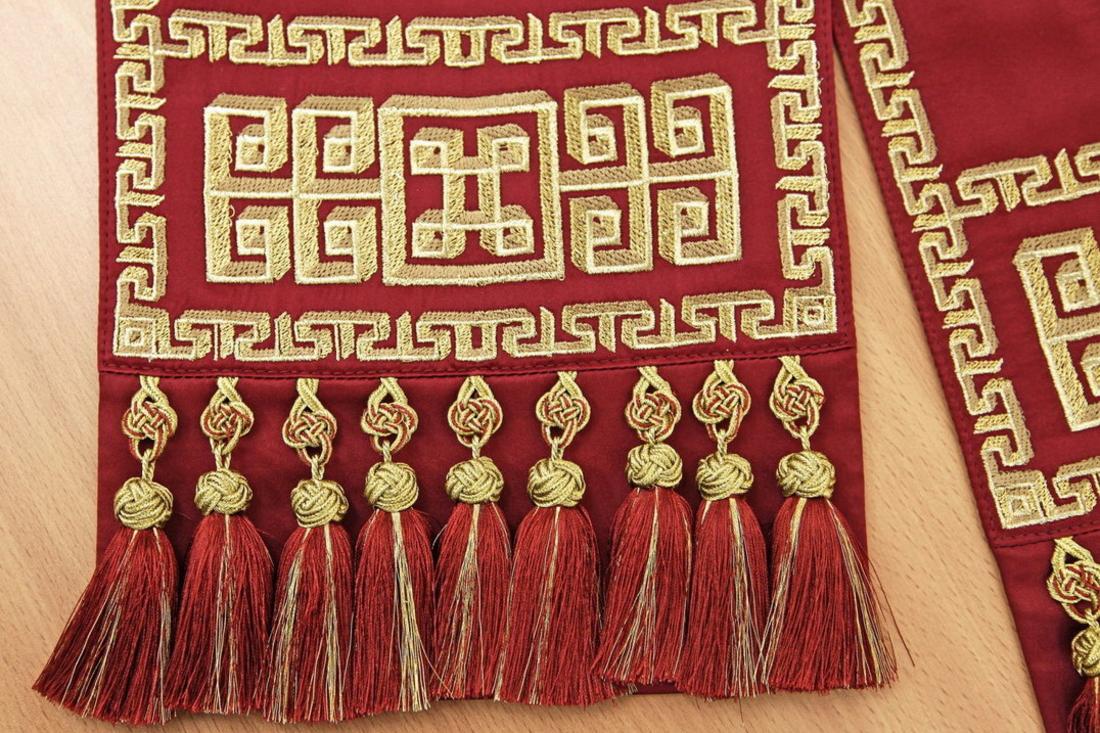 Из такой ткани шьют облачения без вышивки. Для вышитых изделий используется однотонная ткань. Отмерив нужное количество ткани, ее затем проклеивают дублерином, чтобы она не растягивалась и вышивка не смещалась.