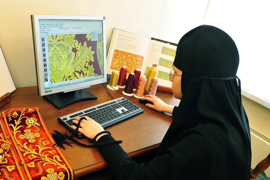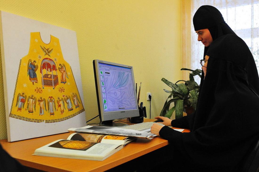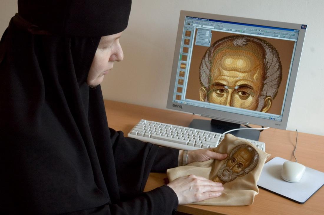 Сестра, сидящая за компьютером, буквально вышивает облачение, только не иглой, а компьютерной мышью. Для этого ей нужно не только владеть современными технологиями компьютерной вышивки, но быть, прежде всего, умелой вышивальщицей, хорошо знающей разнообразные приемы ручной вышивки. Ей нужно вышить каждый стежок, в разных фрагментах задать разные направления нити, разные способы вышивки, разную плотность и т.п. Часто, чтобы добиться нужного цветового эффекта, вышивка делается в несколько слоев, подобно тому, как в иконописи краски накладываются слоями. Кроме того, сестра, создающая программу, должна для каждого фрагмента вышивки прописать номер иглы, цвет и марку нитей. Она же прописывает последовательность, в какой будут вышиваться фрагменты: например, вышивальная машина вышьет несколько элементов, затем остановится, у нее поменяют нити, иглы, настройки, передвинут пяльцы; затем машина вышьет следующий фрагмент, снова перемена нитей и так далее. Сестры часто советуются друг с другом.