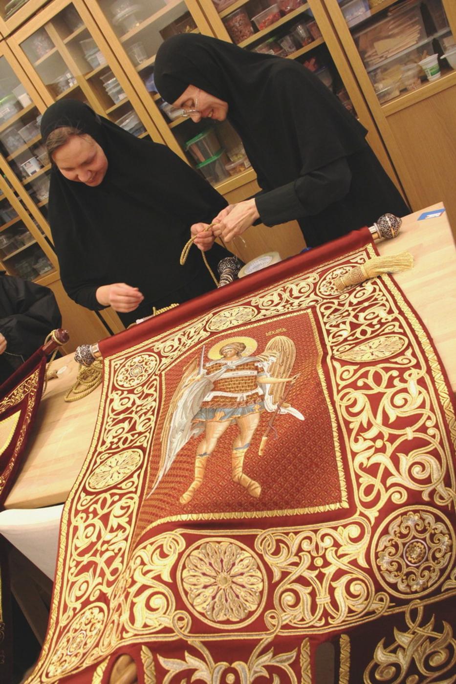 Сестры прикрепляют вышитую хоругвь к древку. На хоругви вышита икона св. Архистратига Божия Михаила.