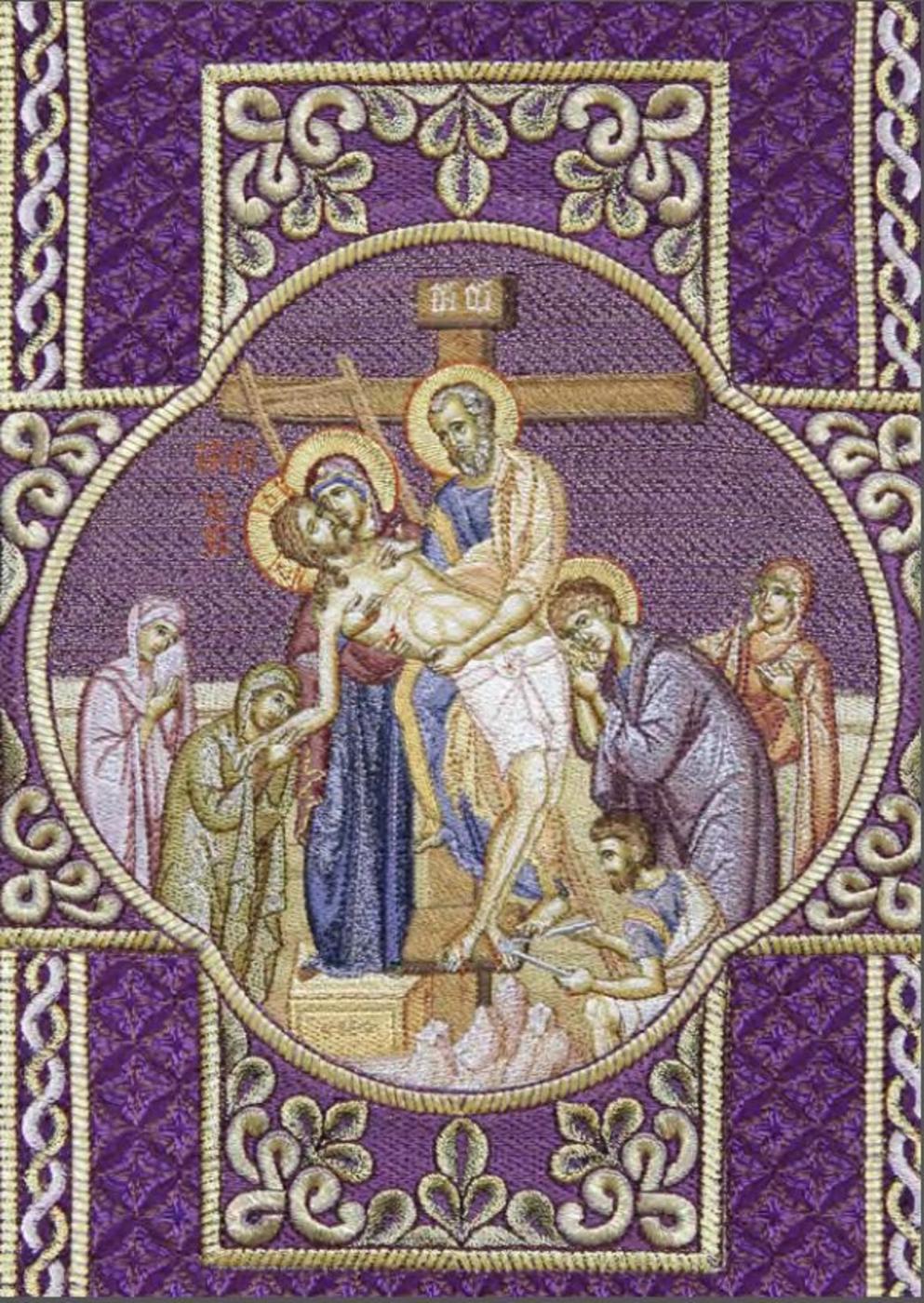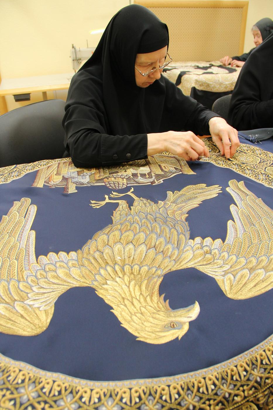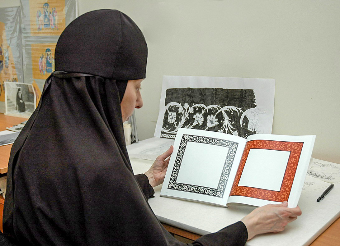 Как создается каждое вышитое изделие? Сначала сестры-вышивальщицы просматривают книги с древнерусскими и византийскими орнаментами, с Афонскими и греческими миниатюрами, альбомы с репродукциями икон и облачений прошлых веков. Из этой неисчерпаемой сокровищницы церковного искусства сестры выбирают разнообразные детали для своих изделий: орнаменты, узоры, композиции, иконописные изображения.