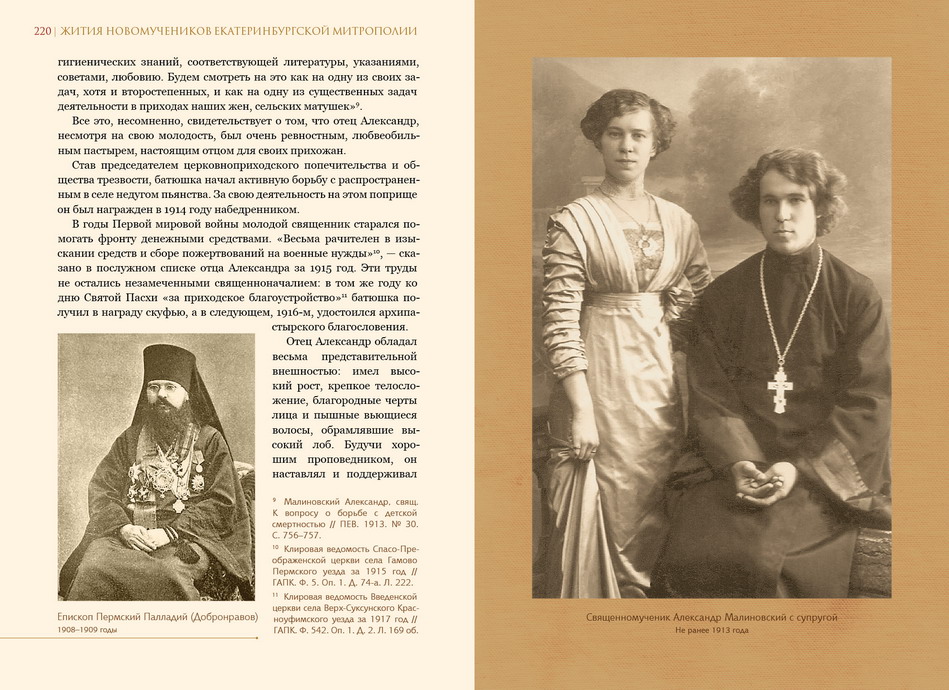 Вот, например, священномученик Александр Малиновский ― один из самых молодых святых Екатеринбургской митрополии. Он стал священником в 21 год и отдался пастырскому служению со всем жаром юного сердца. Отец Александр был законоучителем в двух сельских церковноприходских школах и к своему делу относился творчески. Например, он возил детей в паломнические поездки, в том числе побывал с ними в Спасо-Преображенской Фаворской мужской пустыни. «Все расстояние от Фаворской пустыни до пристани Елово (6 верст) дети прошли пешком, делясь своими радостными впечатлениями», — вспоминал потом батюшка. Ездил в паломничество отец Александр и со взрослыми прихожанами – например, в Тобольск, на прославление святителя Иоанна (Максимовича). В повседневной жизни молодой батюшка очень близко к сердцу принимал все трудности своих прихожан. Особенную боль у него вызывали частые болезни и смерти крестьянских детей. Он лично исследовал причины детской смертности и написал воззвание к сельским пастырям, где предлагал реальные меры для борьбы с ней.