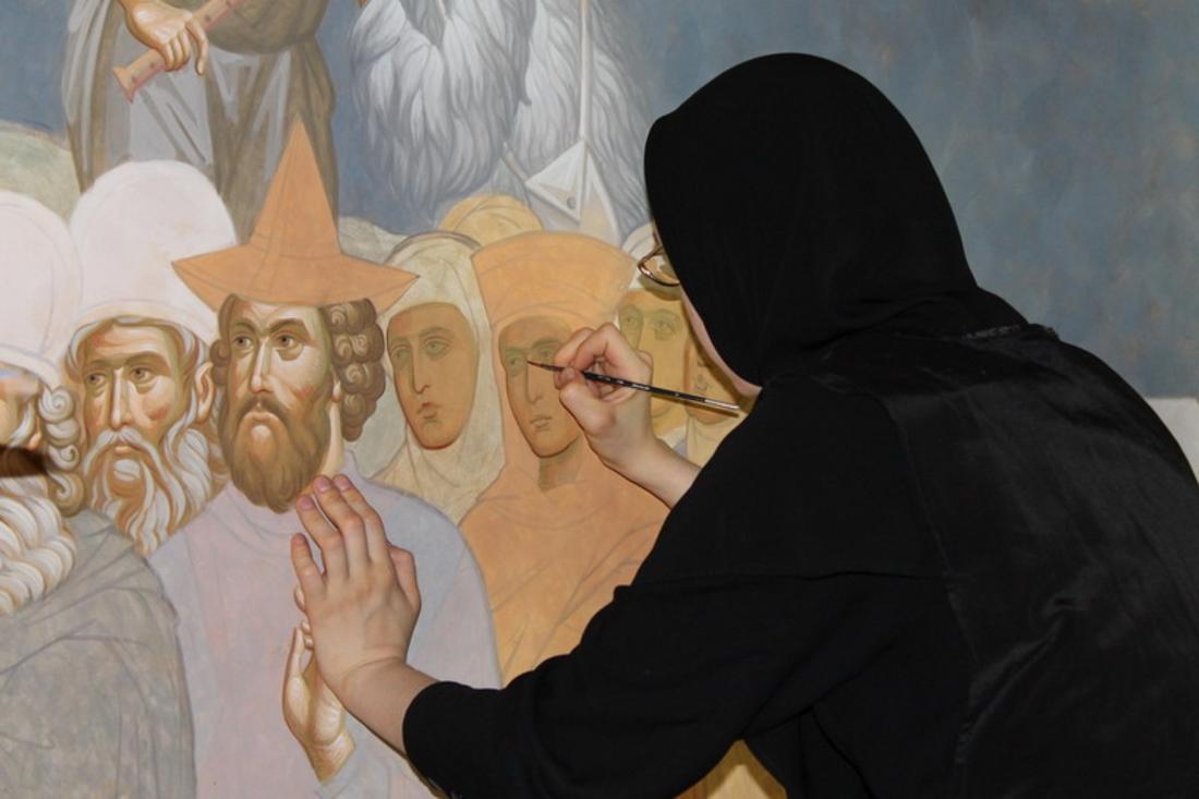 Уже более пятнадцати лет сестры осваивают непростое искусство фресковой живописи. Сложность его состоит и в необходимости заполнить росписью большое пространство, и в очень крупных размерах образов (например, диаметр нимба Спасителя в куполе монастырского собора составляет 4 метра), и в создании многофигурных композиций. Сестрами расписаны несколько монастырских храмов.
