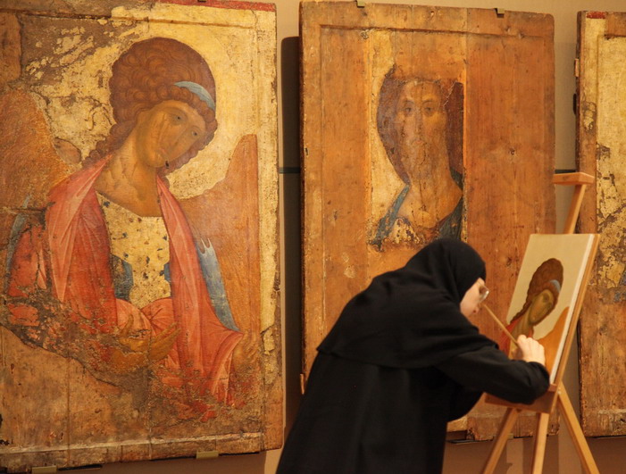 Той же работой – изучением и копированием древних икон – монахини-иконописцы занимались в Третьяковской галерее, где находится одно из самых больших собраний древнерусских и византийских икон в России, в том числе иконы, написанные преподобным Андреем Рублевым.
