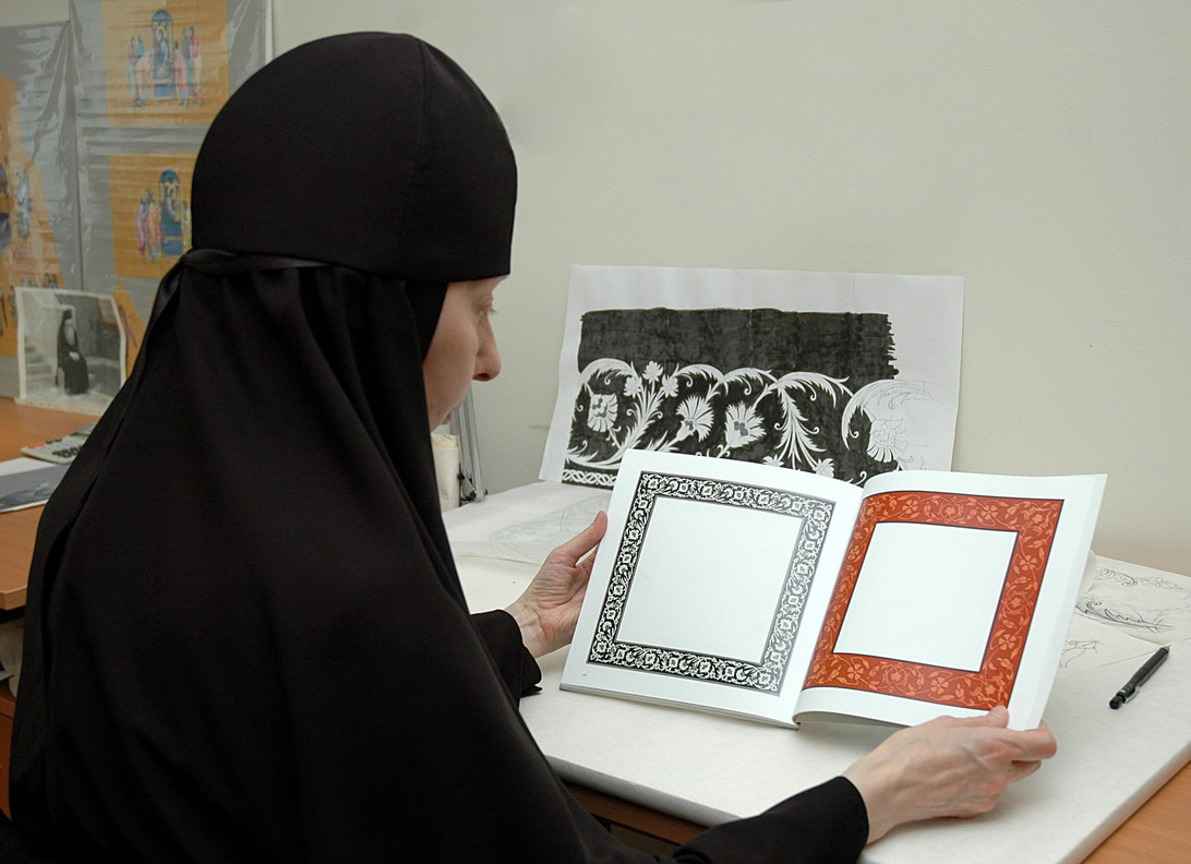 Всё начинается, конечно же, с поиска идеи. Каждое облачение, плащаница или любое другое изделие – это миниатюрное изображение духовного мира. И все его детали должны быть подобраны очень тщательно. Сестры просматривают множество узоров, орнаментов, икон, которые можно использовать в создании композиции.