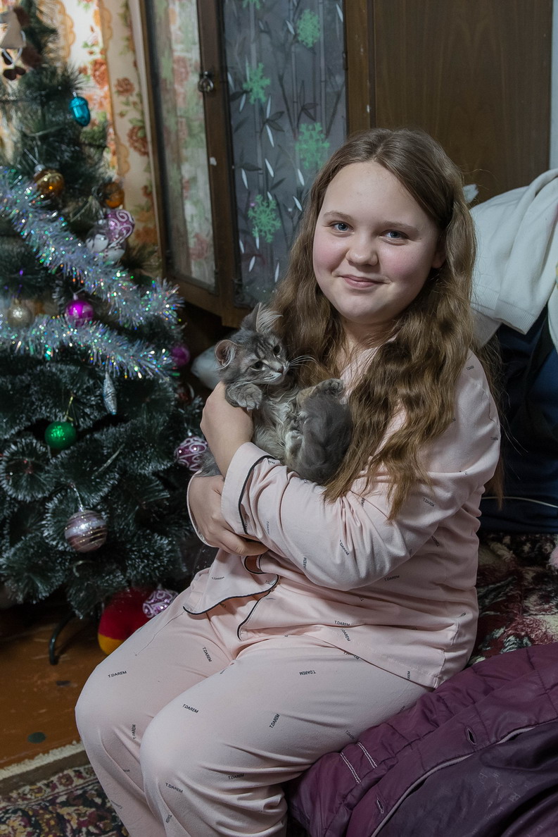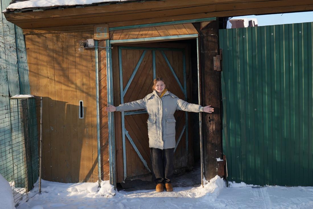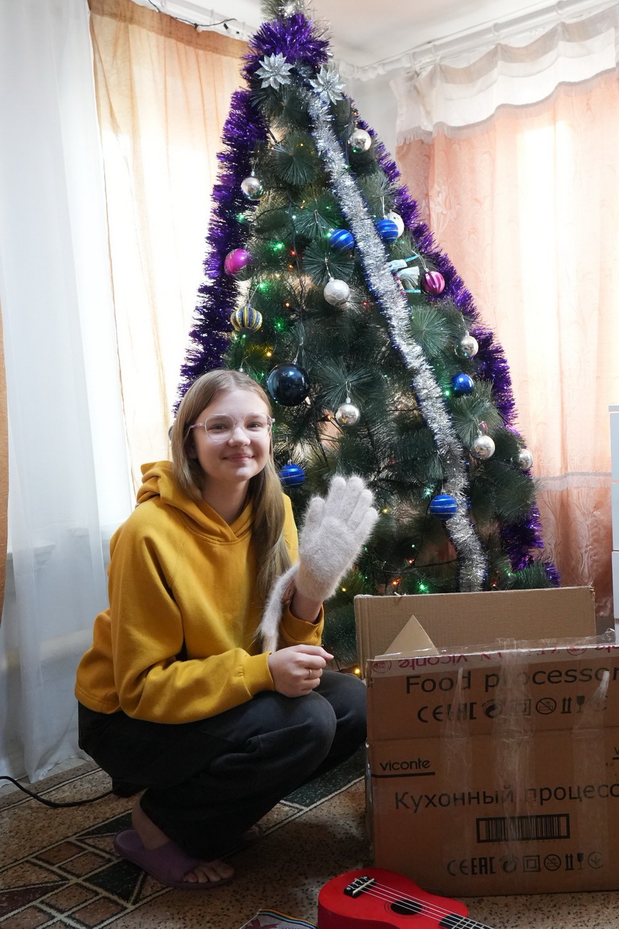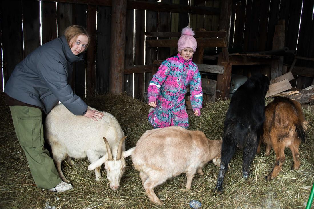 1,5 годовалая София спала, когда мы приехали, и будить малышку не стали, подарки разбирали Арина, Лиза и их мама – вдова с тремя дочерями. На днях она обморозила руки глубоко, так что пришлось добираться до травмпункта, а он в 60 километрах от поселка, как и ближайшая больница. У этой семьи был долг за бурение скважины, которая вышла дороже, чем рассчитывали, и получилось помочь им закрыть долг, так что в новый год семья вступила без кредитов и долгов! И это еще одно Рождественское Чудо этой акции. Несмотря на то, что в семье нет мужских рук, они держат несколько коз и кур. Козочки как раз вышли погулять и покушать во двор, где их удачно поймала фотокамера. Девочки радовались наушникам, красивым канцтоварам и наборам для творчества, а мама – кухонному комбайну.