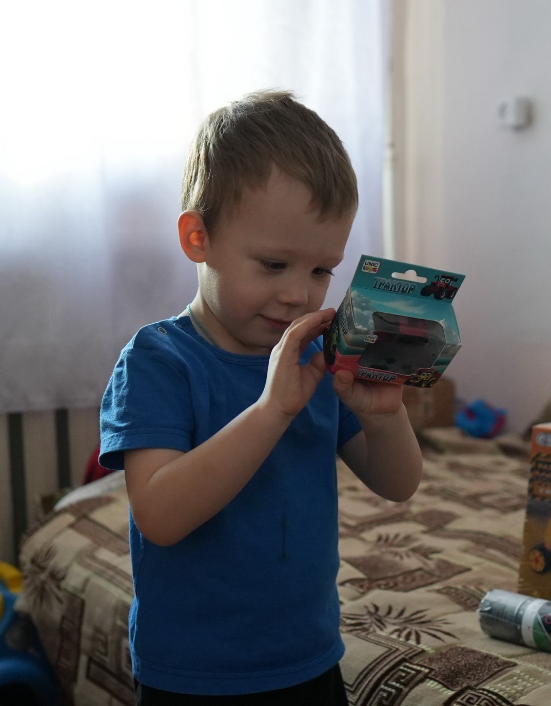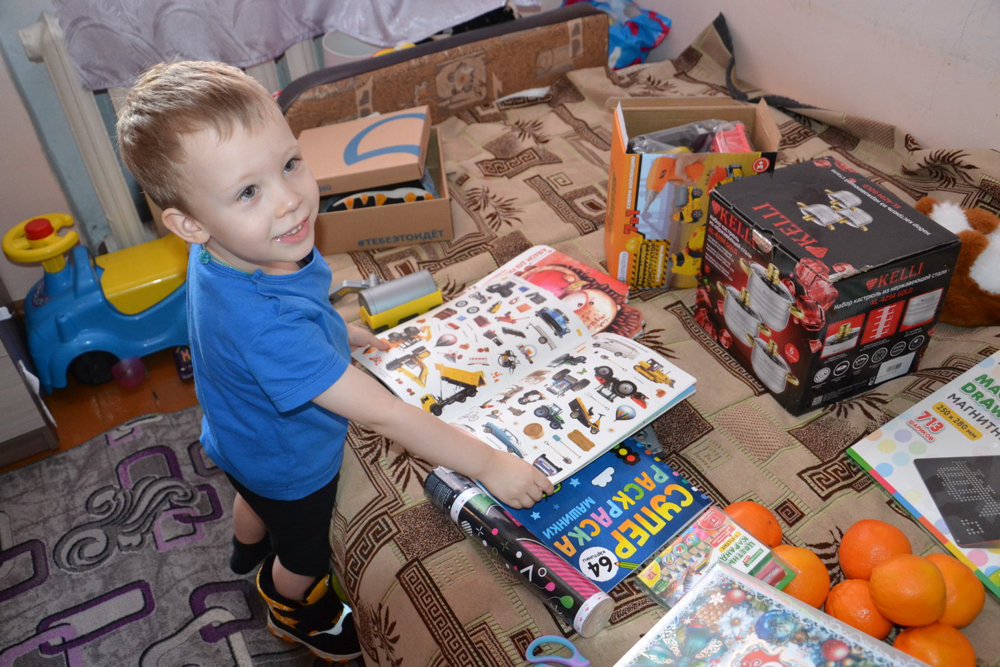 4-летний Прохор сначала очень стеснялся и крепко держался за маму, но постепенно оживился и уже с удовольствием разбирал книги о машинах, раскраски о машинах, сами машины, игры с машинами и конструктор машин с шуруповертом. Зимние ботинки тоже подошли, а мама обрадовалась набору кастрюль.